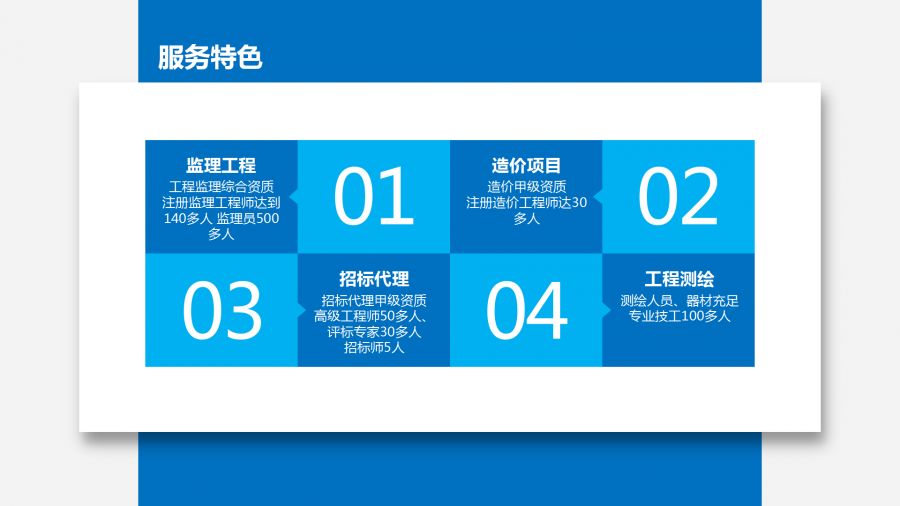 中高级工程师320余人,具有各类全国注册证书的从业人员230余人,其中监理工程师150人、全国一级建造师35人、全国注册造价工程师30人、全国注册安全工程师14人等。监理培训从业人员400余人,二级建造师53人,招标代理从业人员60人、政府采购培训人员20人、评标专家30余人。庞大的人才资源储备队伍,以求满足企业扩展需要。